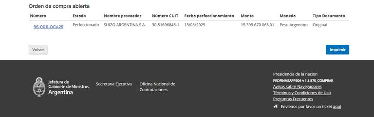 Estos adjudicatarios también se observan para el período 2024, con excepción de la Armada. De este modo, la información disponible en el sitio oficial de compras del Estado, Compr.Ar, no refleja contrataciones a favor de Suizo Argentina a cargo de la Agencia Nacional de Discapacidad, pese a los audios atribuidos a su exdirector.