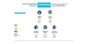 La encuesta también midió la imagen de dirigentes nacionales. Javier Milei registra 47% de imagen positiva y 46,1% negativa. Cristina Kirchner aparece con 27% positiva y 55,1% negativa, mientras que Mauricio Macri obtiene 22,8% positiva y 48,1% negativa. En el caso de Axel Kicillof, su imagen positiva es de 33,6% y la negativa de 51,5%.