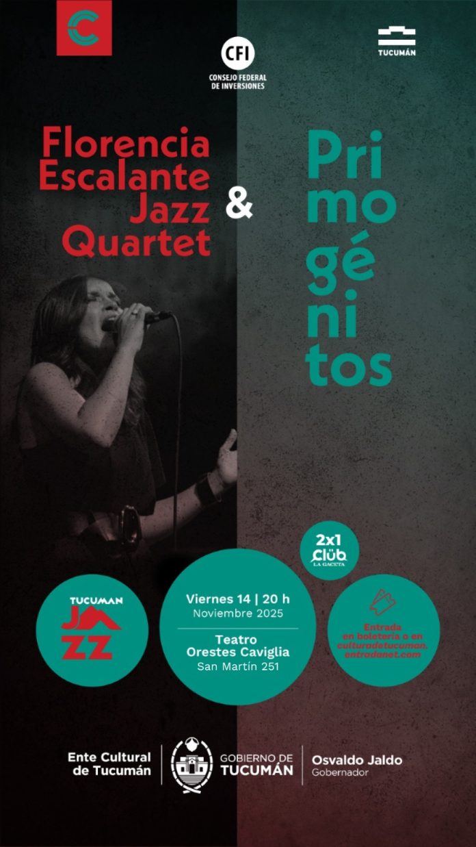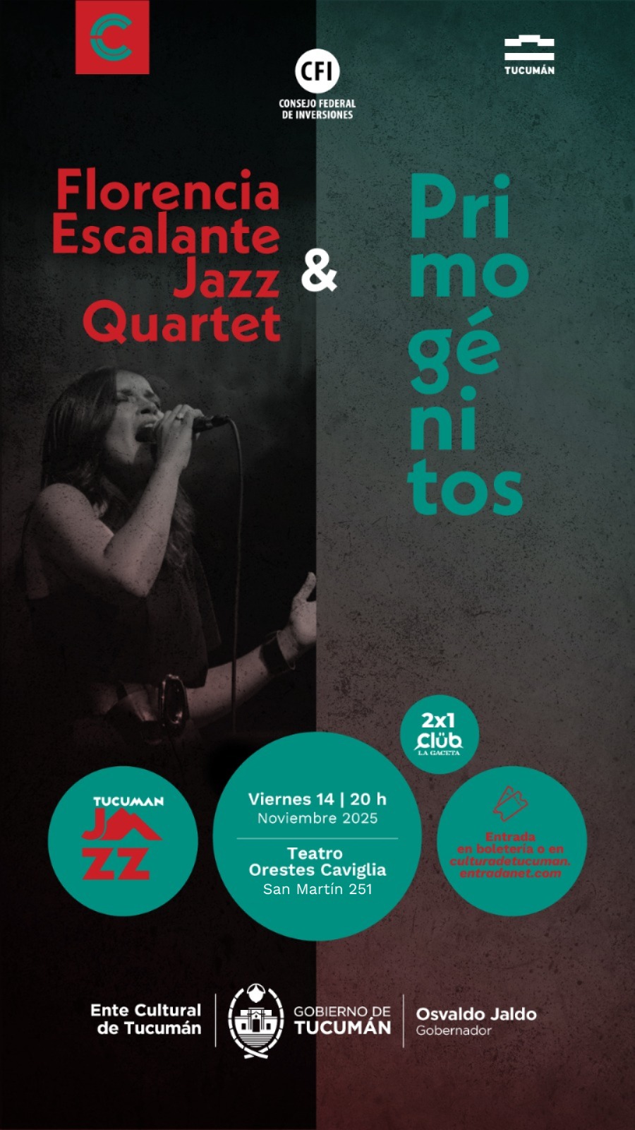 El Ente Cultural de Tucumán presenta una noche dedicada al talento local dentro del 6° Tucumán Jazz, con dos propuestas que muestran la fuerza y diversidad del jazz tucumano: Florencia Escalante Jazz Quartet y Primogénitos.