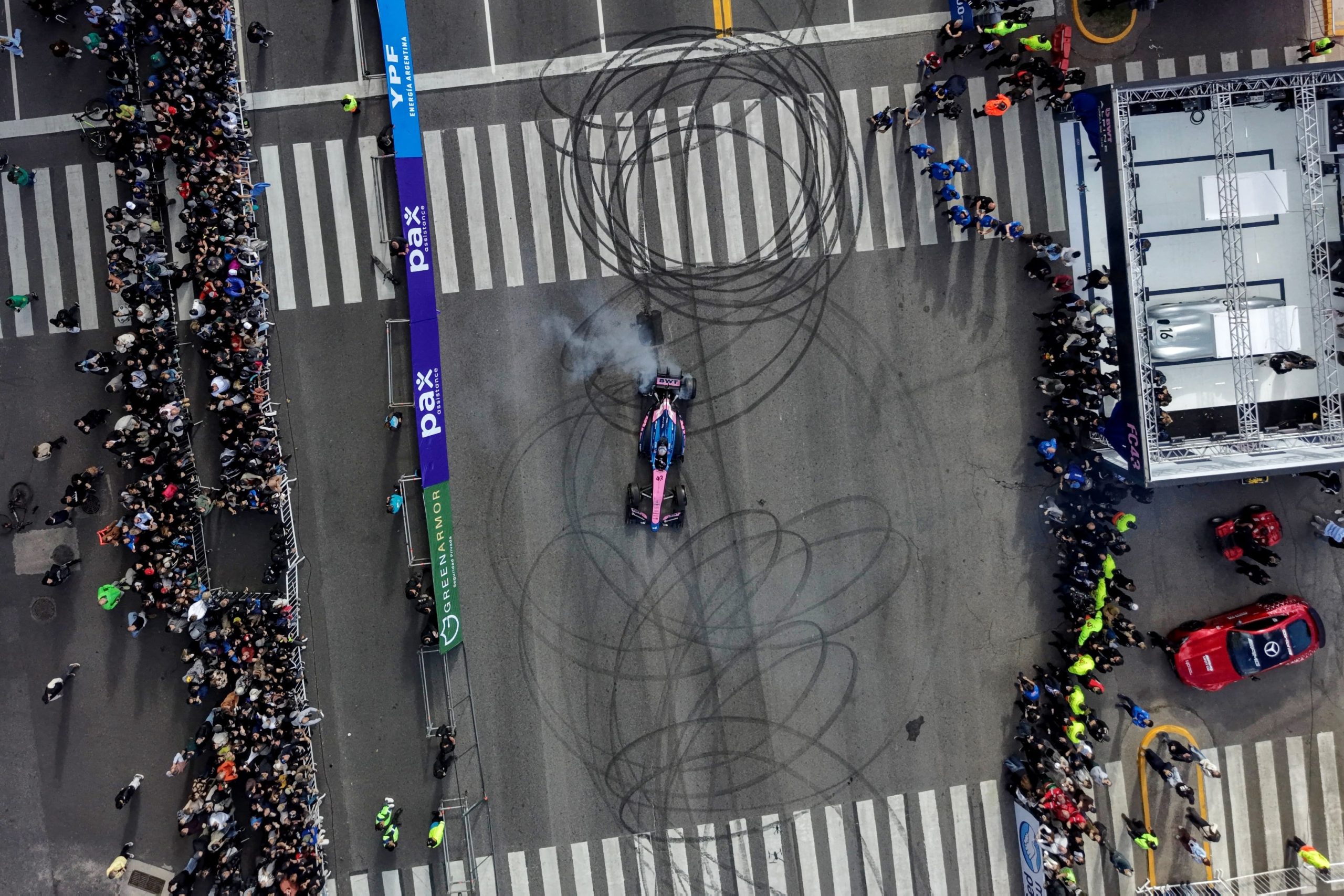 Finalizada la exhibición, que se extendió por más de seis horas, comenzaron a circular videos y fotografías que mostraban el estado en el que quedó el Lotus E20. Las imágenes revelaron un desgaste notable en varias partes del auto, especialmente en los neumáticos, que terminaron completamente degradados. Durante el evento, Colapinto aceleró a fondo sobre la Avenida del Libertador y realizó las tradicionales “donuts”, maniobras que dejaron marcas visibles en el asfalto y provocaron la ovación del público.
