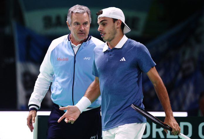 Javier Frana habla con Francisco Cerúndolo durante la serie que Argentina perdió con Alemania en Bolonia (Foto REUTERS/Guglielmo Mangiapane)