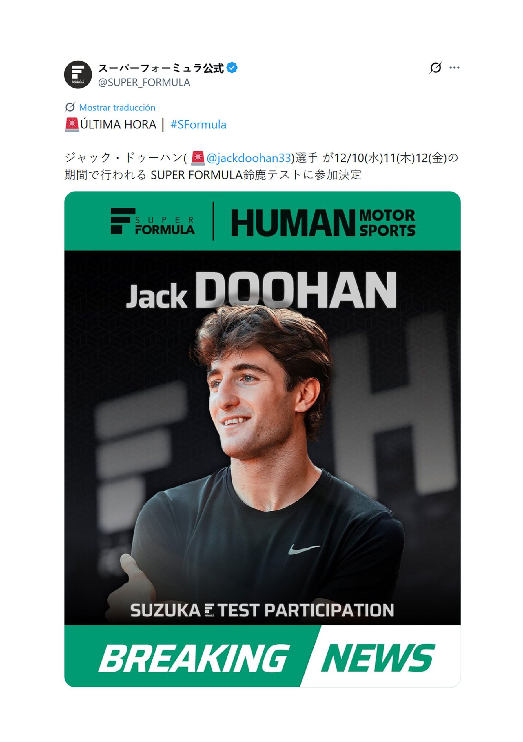 El medio News de Japón subrayó que un “estancamiento” en las negociaciones entre Doohan y Flavio Briatore para rescindir el acuerdo puso en peligro el arribo de Jack a estas pruebas en Japón. “Según una fuente cercana a Doohan, a menos de 24 horas de su salida programada hacia Japón, Briatore aceptó los términos de su liberación, lo que le permitió realizar pruebas con Kondo Racing”, destacaron. En Auto Sport Web también aseguraron que rescindió con Alpine, aunque su objetivo sigue siendo la Fórmula 1: “El primer paso que busca Doohan es un puesto en Haas en 2026″, inicialmente como piloto de pruebas, de simulador y de TPC (Pruebas de Coches Anteriores).