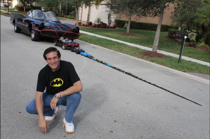Sergio Goldvarg con el Batimóvil original de la serie de los sesenta y todas sus escalas posibles.