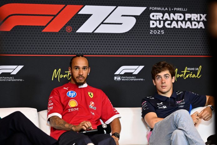 Lewis Hamilton y Franco Colapinto en la conferencia de prensa de la FIA en la previa a la carrera en Canadá (REUTERS/Jennifer Gauthier)
