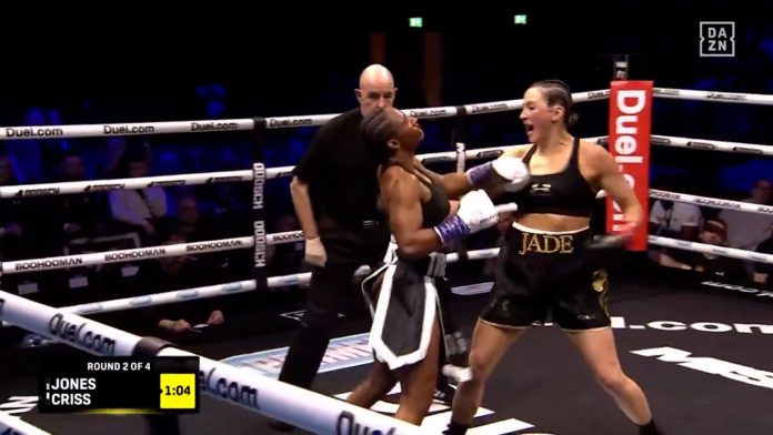 Jones, originaria de Gales, había anunciado su decisión de dejar el taekwondo el año pasado, motivada por la búsqueda de nuevos desafíos y con la ambición de alcanzar la cima en dos deportes diferentes. Su primera aparición en el boxeo profesional se produjo en un combate contra Criss, hija de los raperos Anthony Criss (Naughty by Nature) y Sandra Denton (Salt-N-Pepa), quien llegó al evento sin experiencia previa en deportes de contacto.