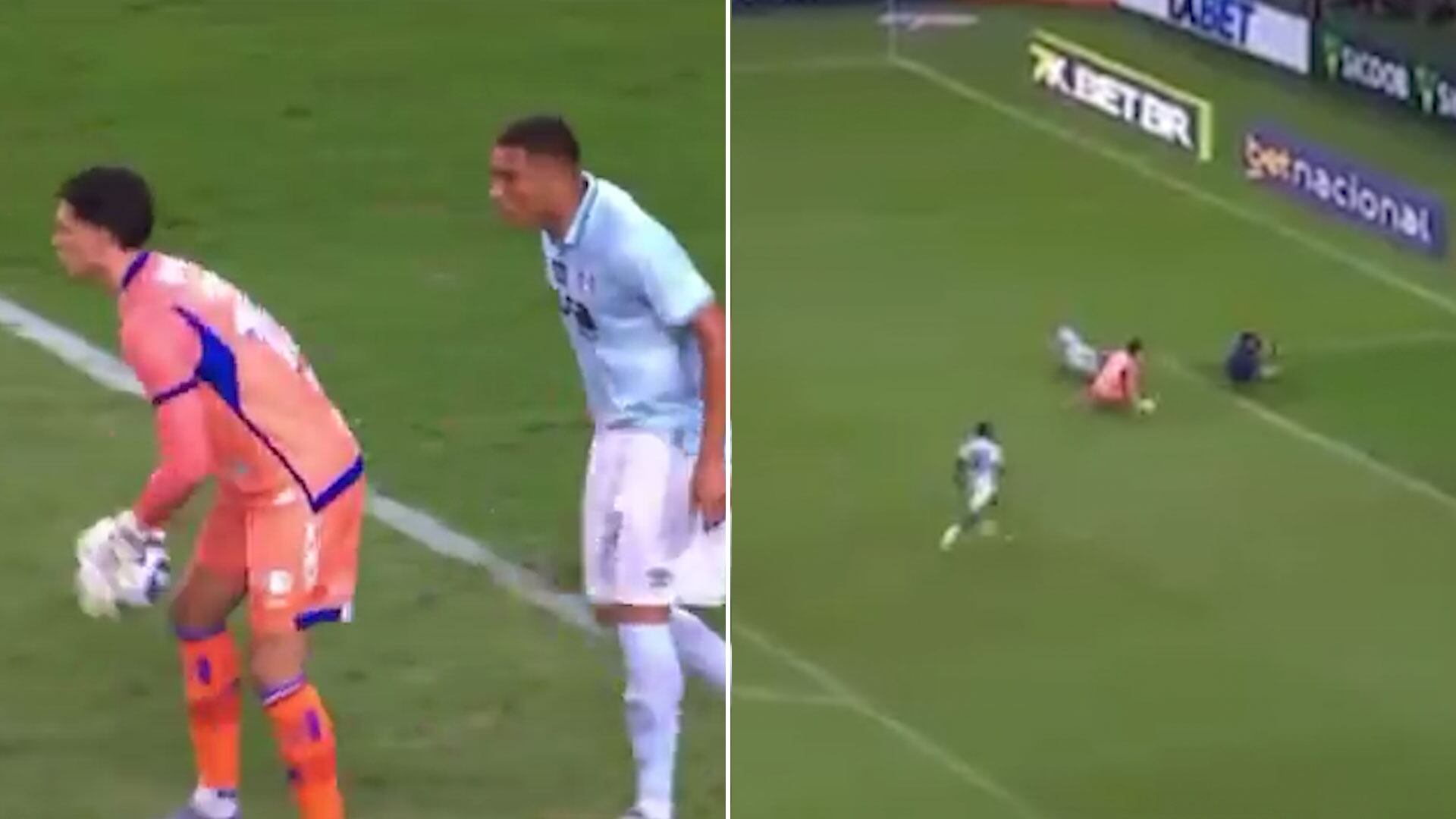El arquero detuvo el balón con ambas manos y, tras frustrar el avance de Gremio, lo depositó en el césped con la intención de realizar un saque largo con el pie. En ese momento, Brenno no advirtió la presencia de Carlos Vinícius a sus espaldas.