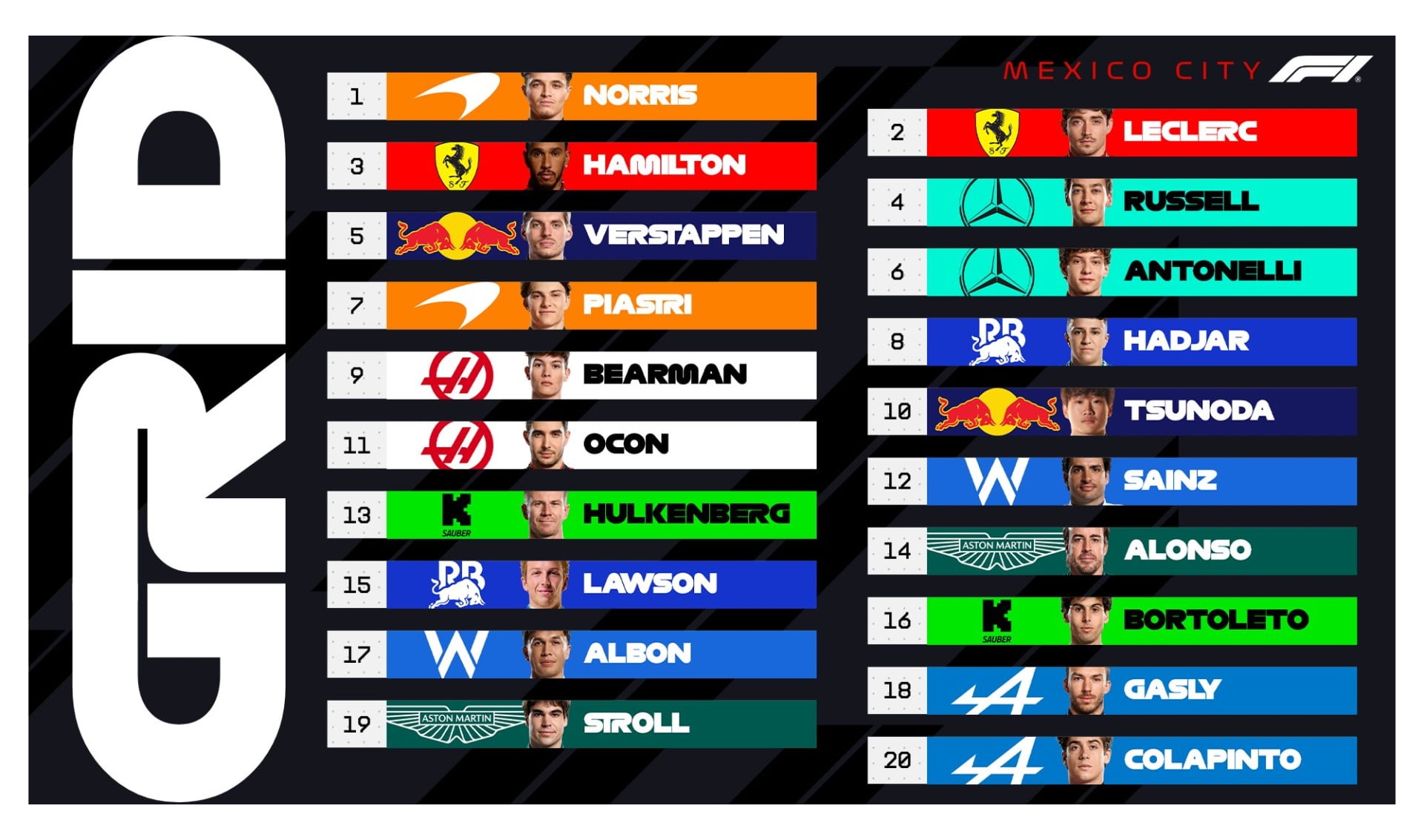 Lando Norris partirá desde la pole y tendrá detrás a las dos Ferraris de Leclerc y Hamilton. Verstappen saldrá desde la tercera fila (5°) y el líder del campeonato de pilotos, Oscar Piastri, lo hará desde el puesto 7. Carlos Sainz, que terminó en el top 10 (fue séptimo en la clasificación), penalizará cinco lugares tras el toque a Antonelli en Austin y saldrá desde el 12° lugar de la parrilla.