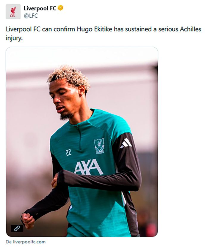El delantero francés Hugo Ekitike, actual jugador del Liverpool, sufrió una rotura del tendón de Aquiles durante el partido de vuelta de los cuartos de final de la Champions League ante el Paris Saint-Germain (PSG) en Anfield. El club inglés confirmó el diagnóstico dos días después del encuentro, en el que el futbolista fue retirado del campo en camilla y visiblemente afectado, tras resbalarse en el césped durante la derrota por 0-2 ante el conjunto parisino.