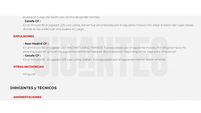 El incidente se produjo durante una histórica caída del Real Madrid por 1-0 frente al Getafe, resultado que generó silbidos y abucheos en el estadio, tanto hacia los jugadores como al cuerpo técnico. Mastantuono ingresó en la segunda mitad y fue expulsado en tiempo añadido tras dirigirle palabras despectivas al árbitro Alejandro Muñiz Ruiz. Las imágenes de la transmisión oficial mostraron cómo el argentino se dirigió al juez principal y recibió la tarjeta roja directa.