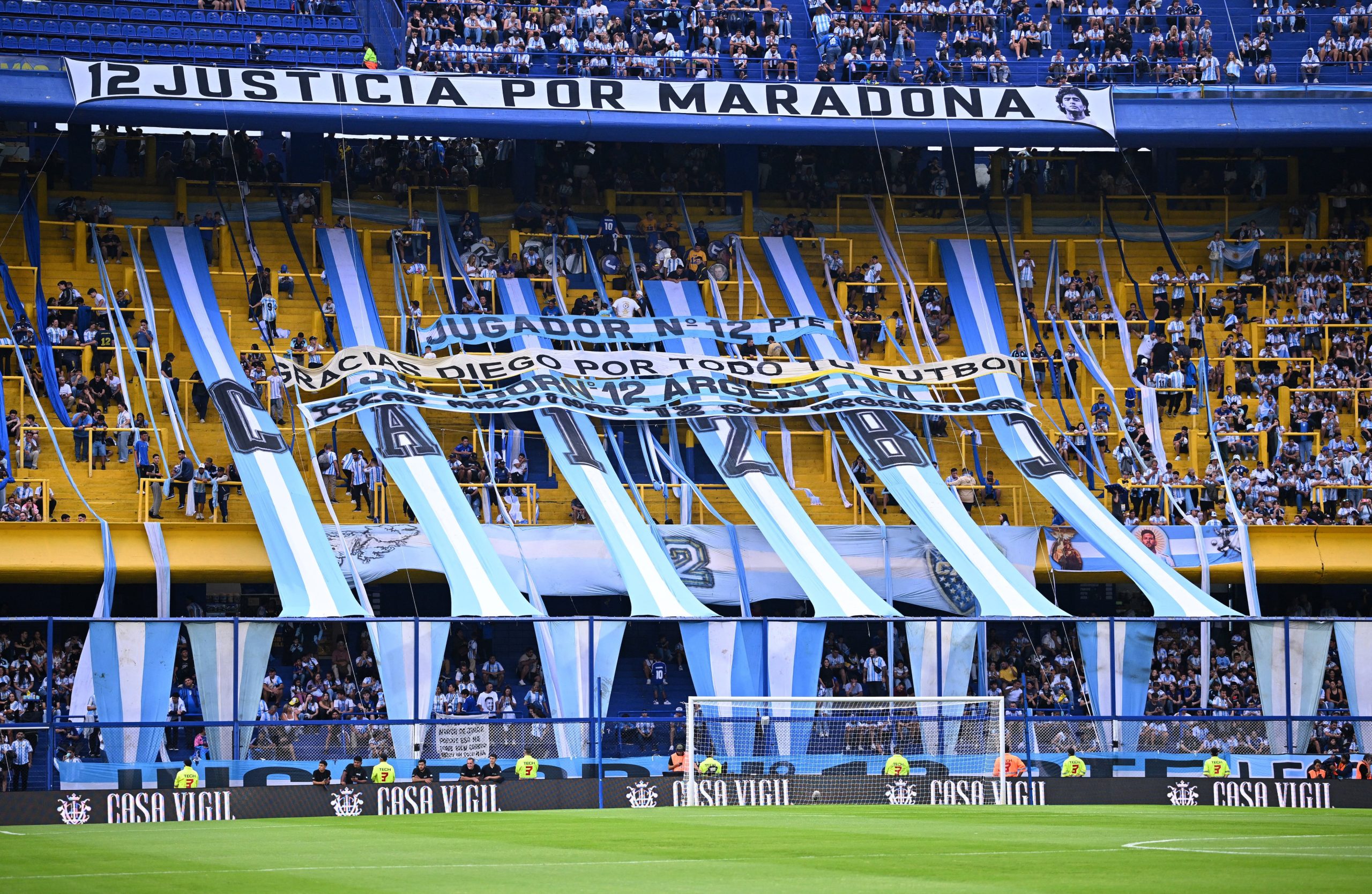 Además de algunas banderas personalizadas con la figura del Pelusa que se ubicaron en las plateas, La 12 dedicó un segmento especial a Maradona con diversas frases. “Justicia por Maradona”, “Gracias Diego por todo tu fútbol” y “Homenaje al mejor jugador del siglo” fueron algunas de ellas. Además, al minuto 10 de partido se gritó “Olé, olé, olé, olé, Diego, Diego”. Y también sonó “Maradóóó, Maradóóó”. El despliegue de banderas durante el recibimiento también incluyó a Lionel Messi y Juan Román Riquelme, con un telón que tenía la frase “campeón del mundo, dos leyendas en un mismo templo”, con la imagen de ambos abrazados compartiendo tiempos como jugadores de la selección.