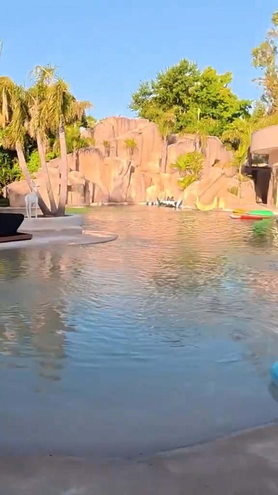 En el recorrido por la vivienda sobresale una piscina con efecto de arena y una cascada en el parque posterior, junto con sectores diseñados para actividades al aire libre. El interior, además, alberga un gimnasio profesional, una piscina cubierta y la sala de entretenimiento que incluye un metegol con la forma de la Bombonera.