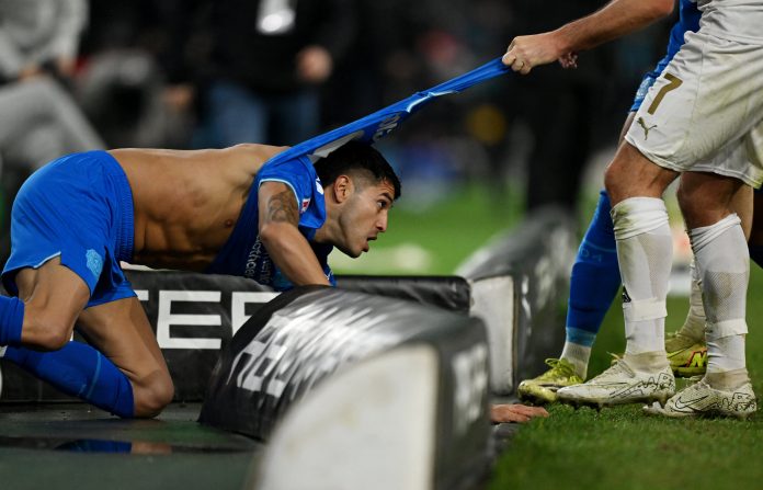 La situación se desató en el minuto 68 cuando el mediocampista del Leverkusen y campeón mundial con la Selección Argentina, disputó un balón cerca de la banda con Kevin Stoger, del Mönchengladbach. Tras una falta, ambos futbolistas intercambiaron empujones mientras sus compañeros intentaban separarlos. En el forcejeo, Stoger logró arrancarle la camiseta a Palacios, quien quedó sin la prenda en pleno campo. La escena provocó un tumulto en el que intervinieron integrantes de los dos equipos y el árbitro Christian Dingert, quien finalmente decidió amonestar a los dos protagonistas y continuar el partido.