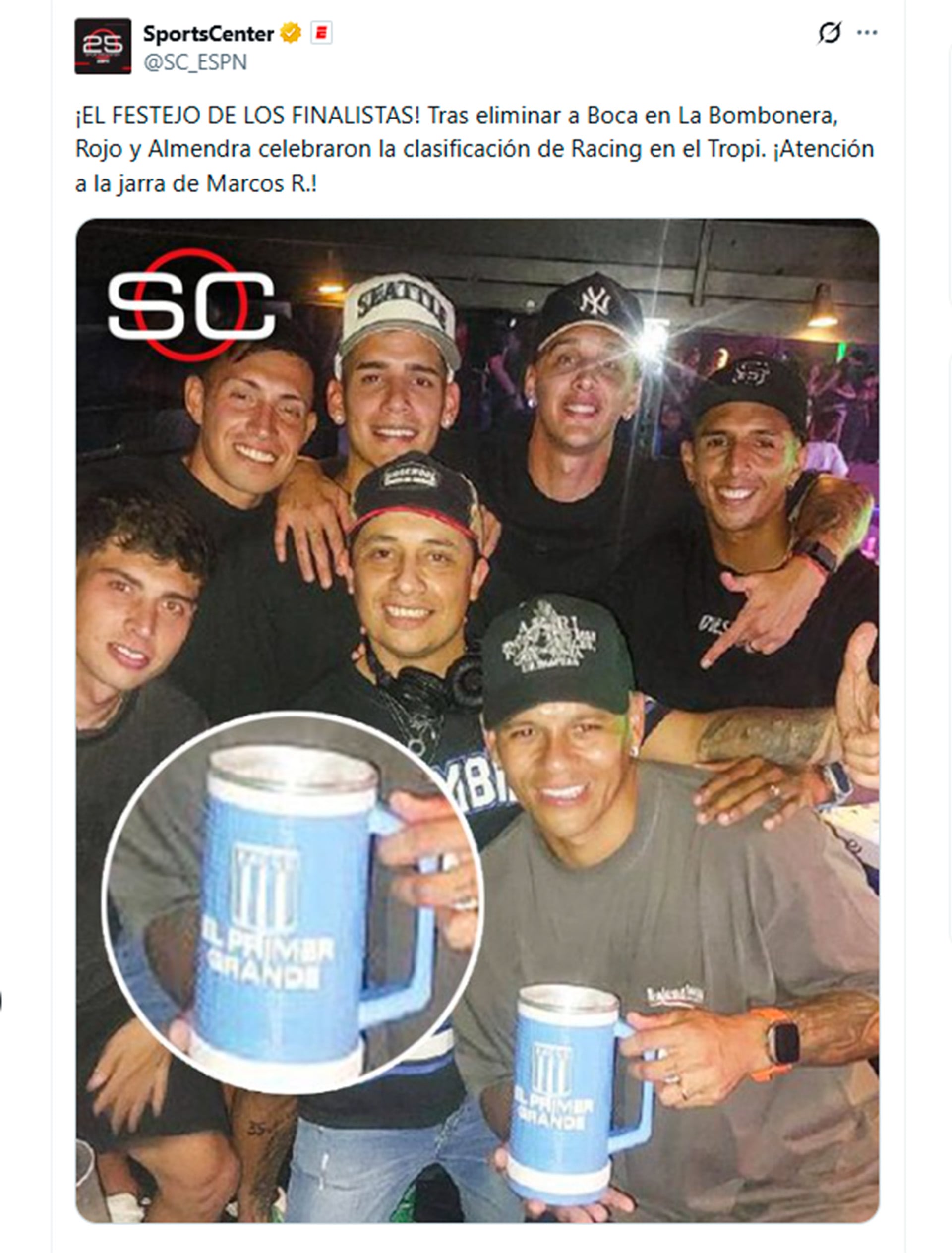 Por otro lado, Rojo aprovechó sus redes sociales para mostrar su alegría por el pase a la final del Torneo Clausura. El defensor reposteó una foto de la cuenta oficial de Racing en sus historias de Instagram, en la que estaban todos los integrantes del plantel con La Bombonera de fondo y escribió: “Gran triunfo, felicitaciones a toda esta banda. Siempre juntos”.