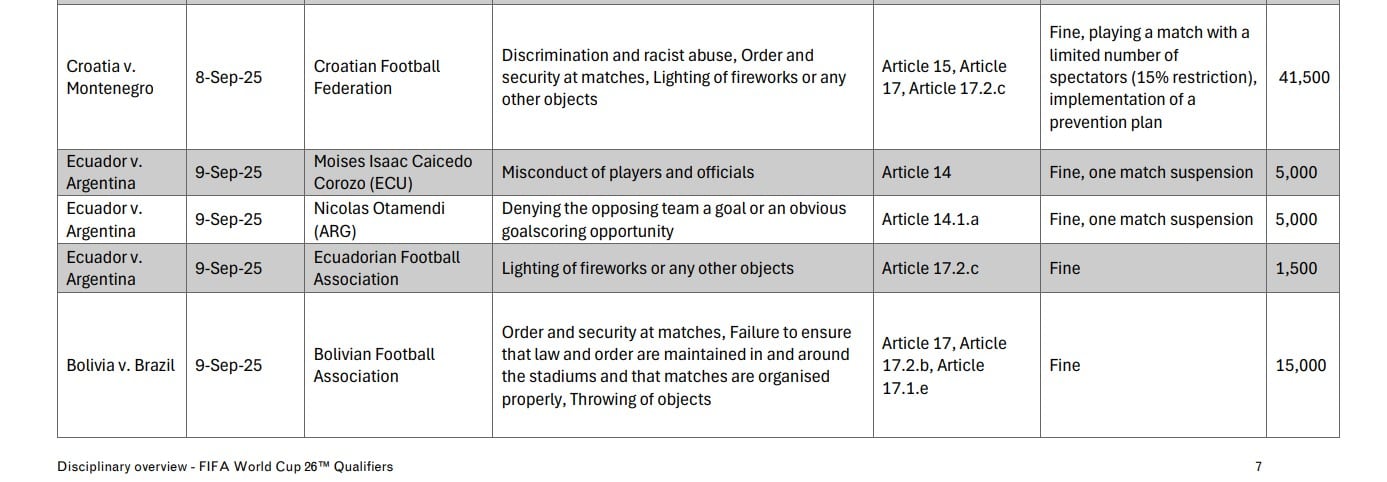 En el informe disciplinario publicado por la FIFA en el que se detallaron las suspensiones de futbolistas y federaciones que participaron de las Eliminatorias camino al Mundial 2026 figuró la pena de un partido de sanción contra Otamendi: “Evitar un gol u oportunidad manifiesta de gol al equipo contrario». Además, la AFA recibió una multa de 5.000 francos suizos (unos 6.300 dólares). Lo mismo ocurrió con el ecuatoriano Moisés Caicedo, que también vio la roja en ese encuentro contra Argentina en Guayaquil.