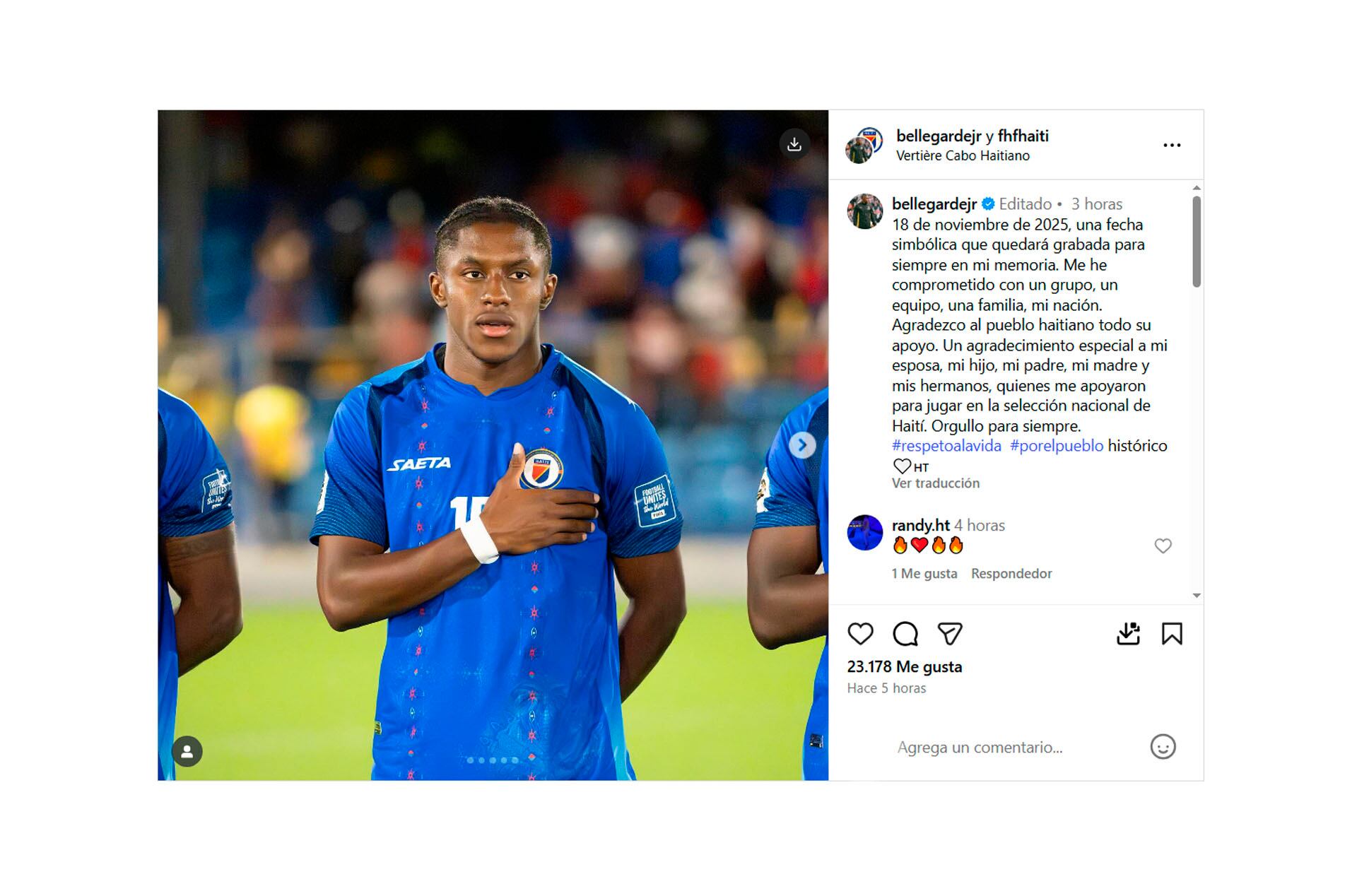 En redes sociales, el futbolista Bellegarde, que juega en el Wolverhampton Wanderers de la Premier League, expresó: “18 de noviembre 2025 una fecha simbólica que permanecerá grabada para siempre. Me he comprometido con un grupo, un equipo, una familia, mi nación. Agradezco al pueblo haitiano todo su apoyo. Mención especial a mi esposa, mi hijo, mi padre, mi madre, mis hermanos, que me apoyaron para jugar en la selección haitiana. Orgulloso por siempre”.
