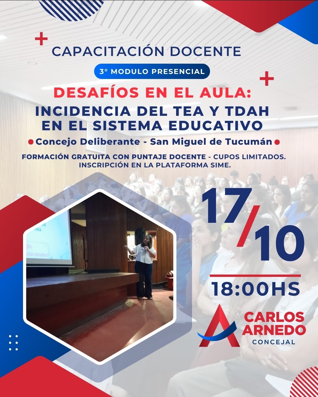 El próximo viernes 17 de octubre a las 18 horas, el Honorable Concejo Deliberante de San Miguel de Tucumán volverá a ser sede de una jornada de formación docente con puntaje, en el marco de la capacitación “Desafíos en el Aula: incidencia del TEA y TDAH en el sistema educativo”, una propuesta conjunta entre el Ministerio de Educación de Tucumán y el Concejo Deliberante.