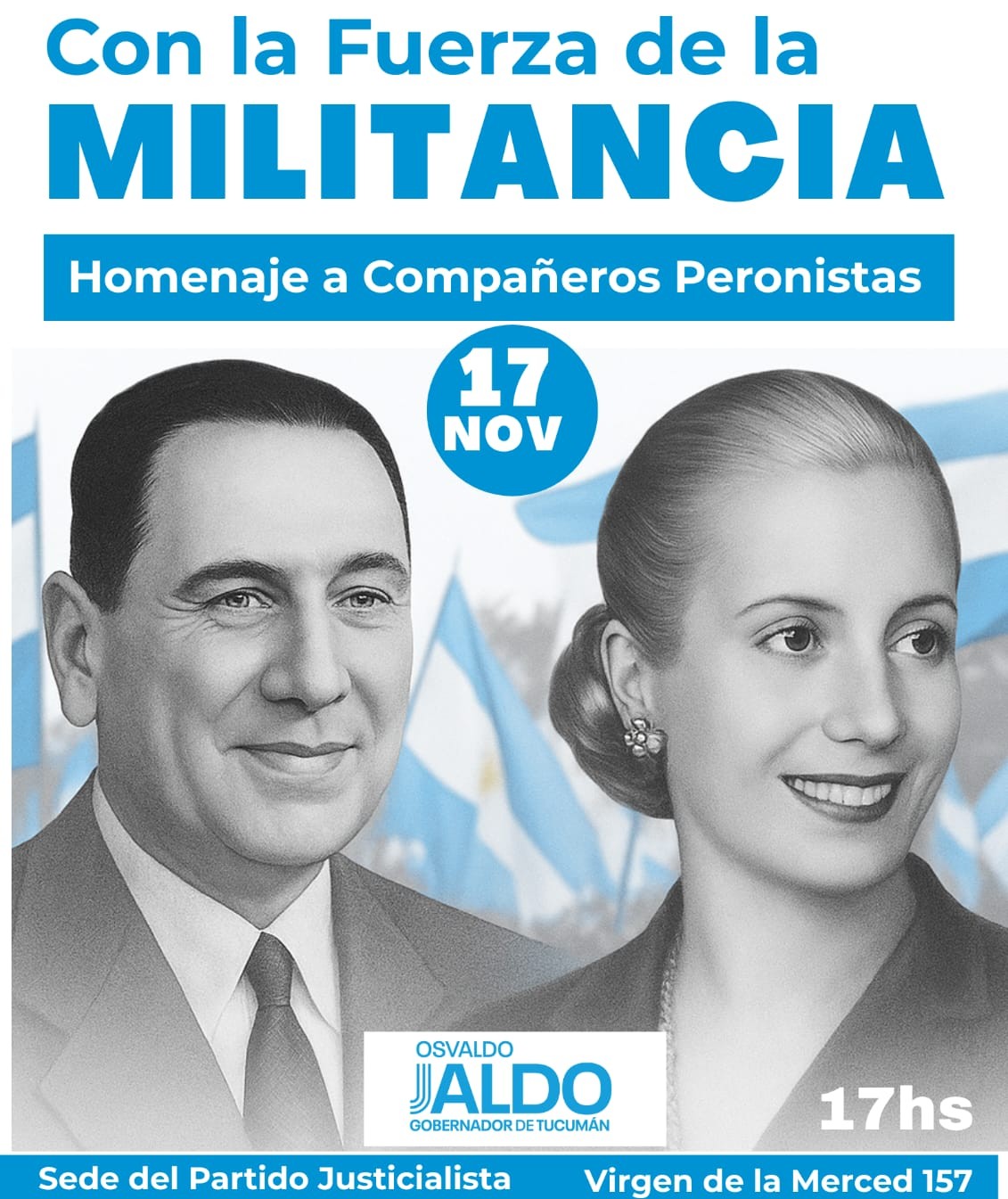 Desde el Partido Justicialista invitan a participar del Acto por el Día del Militancia, este lunes 17 Noviembre a las 17:00 hs en la sede partidaria en Virgen de la Merced 157.