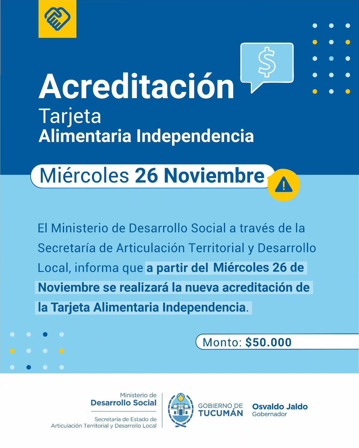 Desde el Ministerio de Desarrollo Social que conduce Federico Masso, siguiendo los lineamientos del Gobernador, Osvaldo Jaldo, informaron que a partir de este miércoles 26 de Noviembre se produce una nueva acreditación de la Tarjeta Alimentaria Independencia (TAI) por un monto de 50 mil pesos.