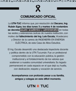 La Facultad Regional Tucumán de la Universidad Tecnológica Nacional informa con profundo pesar el fallecimiento del *Ing. Luis Escala*, quien se desempeñaba como *Vicedecano y director de la Carrera de ingeniería en energía eléctrica* de nuestra Casa de Altos Estudios.