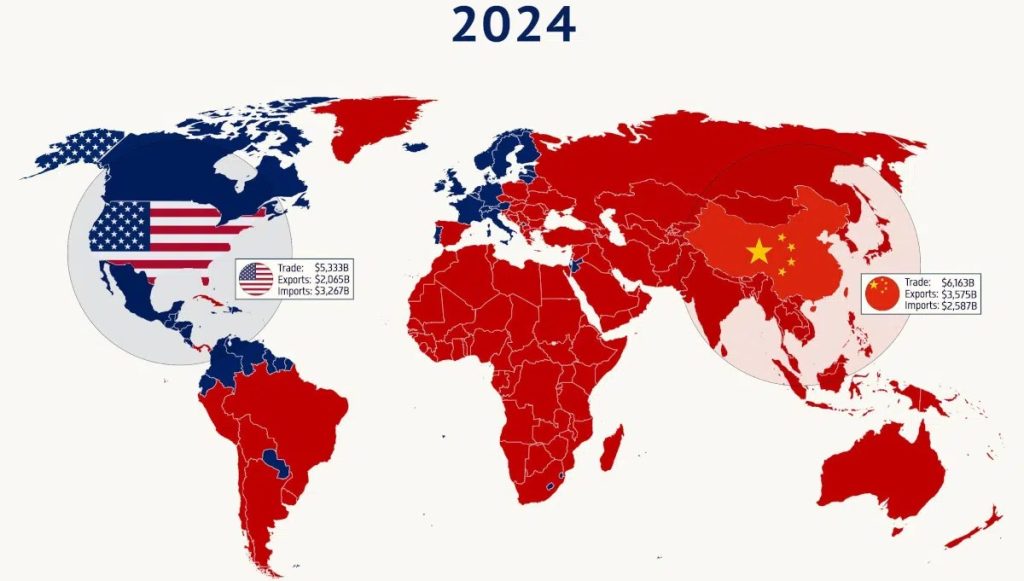 n el gráfico que precede este párrafo se puede apreciar como hace veinticuatro años, el mundo era azul. Un mapa de 2000 mostraba a casi todos los países con Estados Unidos como principal socio comercial: desde el Cono Sur hasta el África subsahariana, el imperio norteamericano tejía su red con la certeza de quien cree haber llegado al fin de la historia. Hoy ese mapa es rojo. La estrategia de China ha logrado superar a EEUU en cantidad de socios comerciales en todo el planeta y no lo ha hecho por medio de una invasión, ni por un golpes de Estado (como el tristemente célebre plan Cóndor, y como prueba de esto este link hacia la web del ministerio publico fiscal) sino porque mientras Occidente debatía el terrorismo tras el 11-s, China construía puertos en Perú, trenes en Kenia y tendía kilómetros de fibra óptica en Laos. Mientras Washington enviaba tropas a Irak, Beijing enviaba ingenieros a Shenzhen. Se podrá argumentar que la diferencia estaba en los recursos, discusión mas que atendible, pero en realidad estoy seguro de que la diferencia está puesta en el horizonte temporal.
