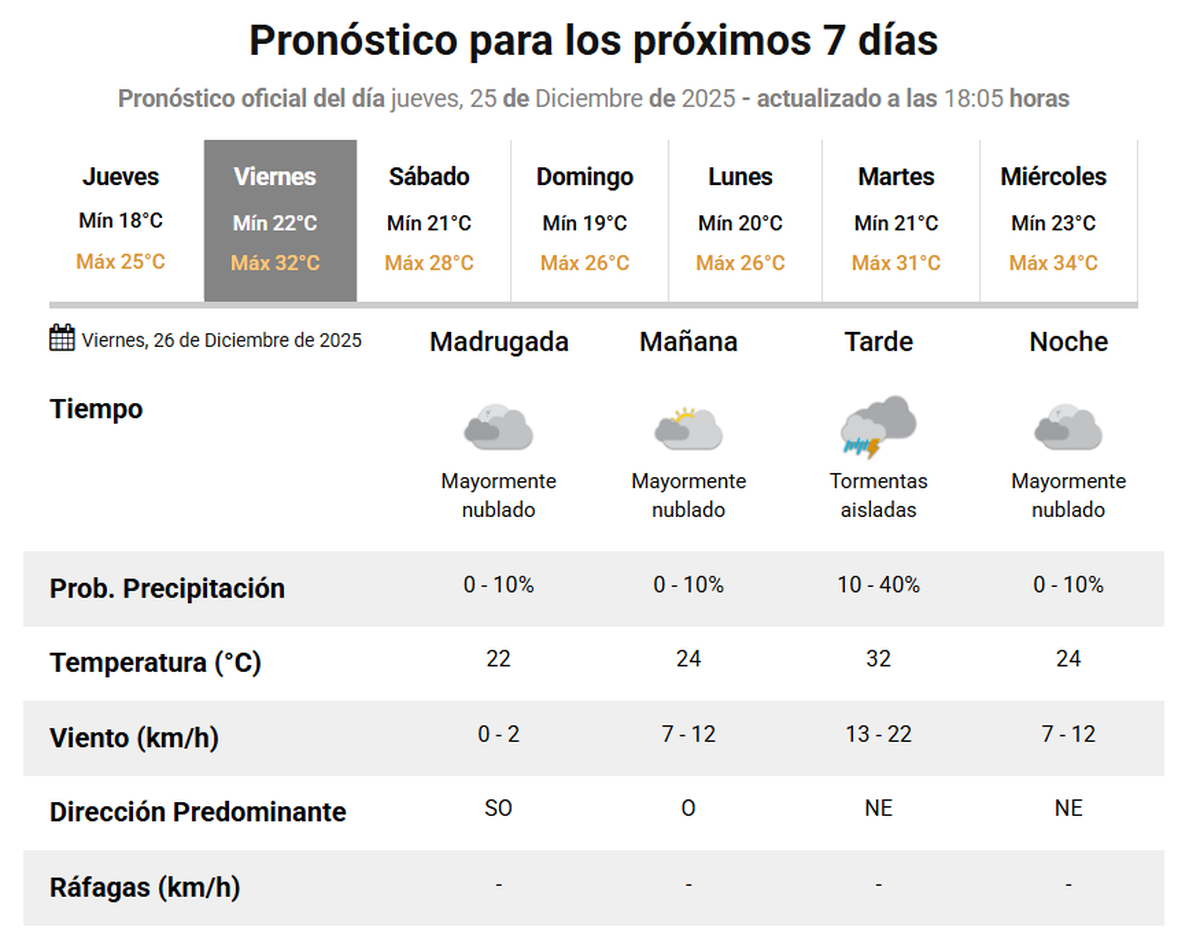 El pronóstico anticipa para el inicio del último fin de semana del 2025, una jornada con cielo mayormente nublado durante la mañana y con la probabilidad de tormentas aisladas durante la tarde.