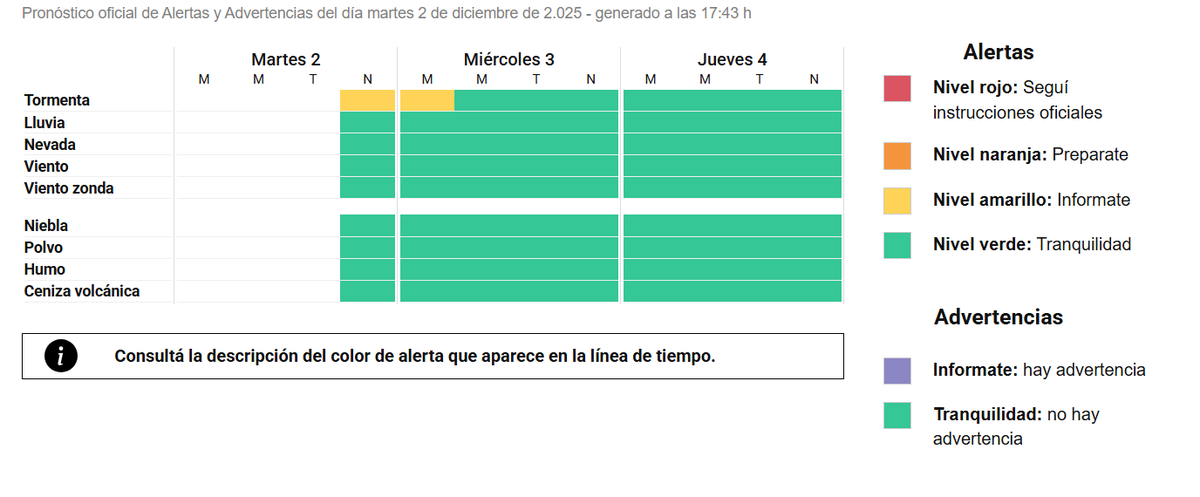 Se prevén valores de precipitación acumulada entre 30 y 50 mm, que pueden ser superados en forma puntual. En las zonas de alta cordillera las precipitaciones pueden ser mayormente en forma de granizo y/o nieve.