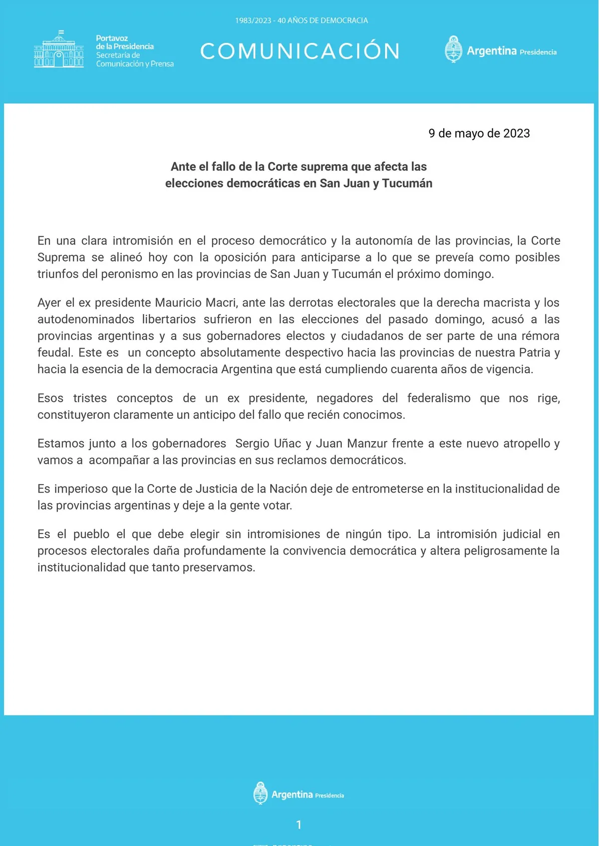 Durante la tarde de ayer martes, la Corte Suprema de Justicia de la Nación (CSJN) dio a conocer dos fallos que suspenden las elecciones en Tucumán y San Juan que tendrían que realizarse este próximo domingo. La decisión fue tomada, en ambos casos, con las firmas de los jueces Horacio Rosatti, Juan Carlos Maqueda y Carlos Rosenkrantz, ante la ausencia del cuarto, Ricardo Lorenzetti.