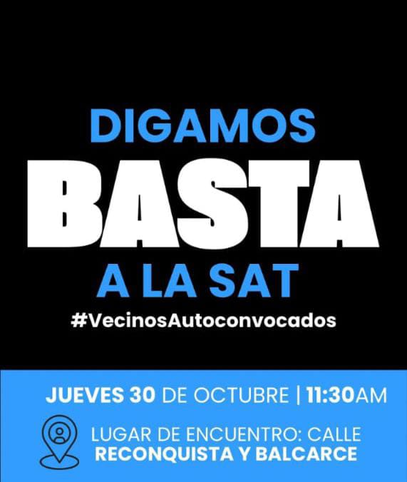 La concentración será este jueves 31 de octubre a las 11:30 en Reconquista y Balcarce, desde donde los vecinos marcharán hacia las oficinas de la SAT.