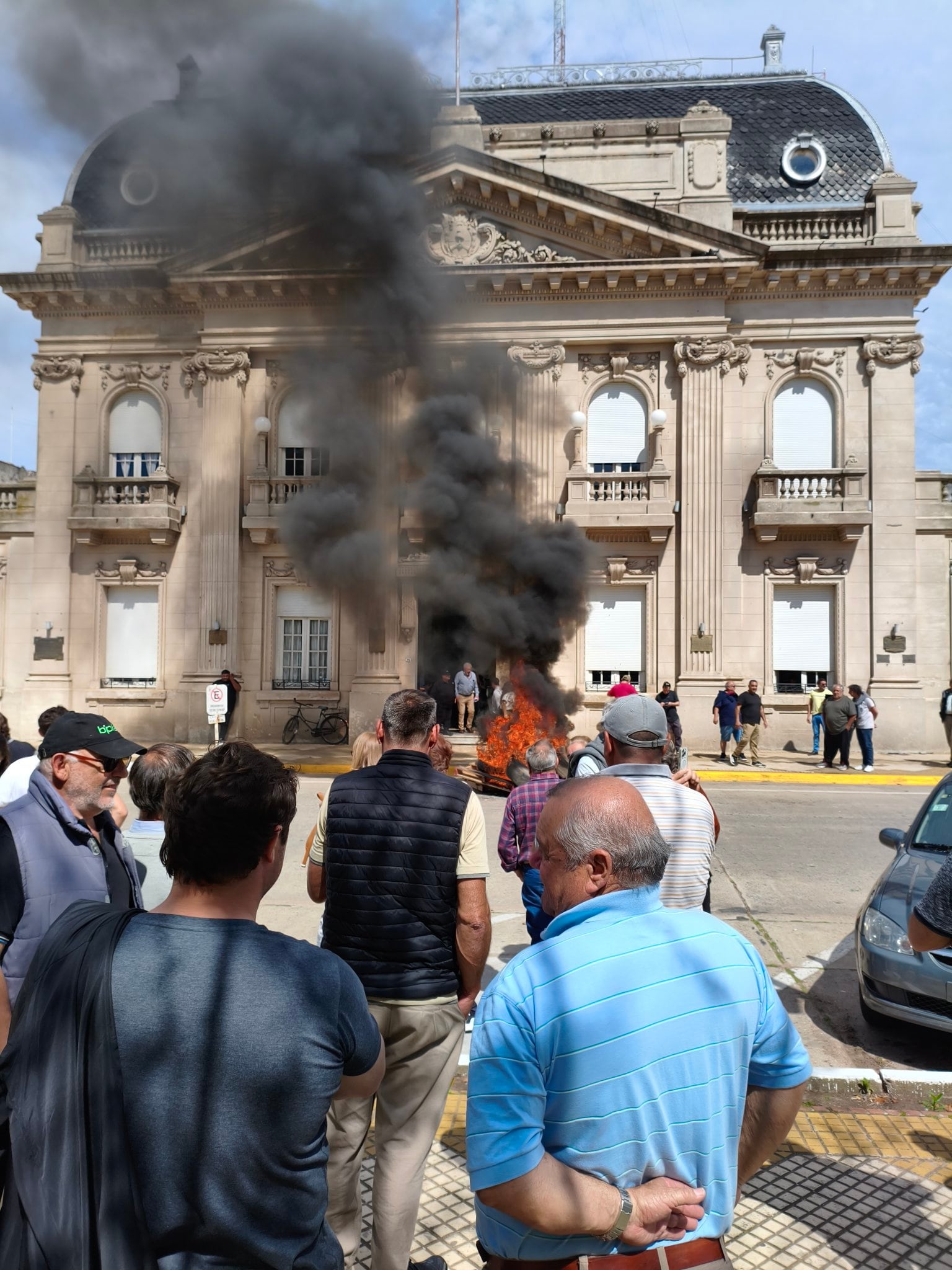 Todo comenzó en la mañana de este lunes, cuando un grupo se apostó frente al palacio municipal y comenzó con la quema de gomas en la puerta del edificio. Posteriormente, fueron recibidos por un integrante del Poder Ejecutivo local identificado como Cristina Poggi, encargado de espacios verdes del municipio.