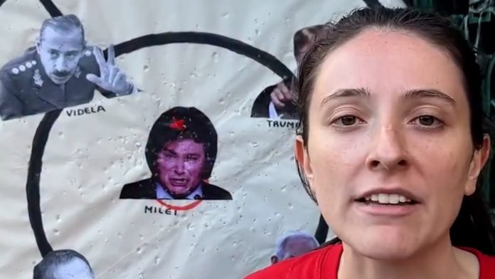 Desde el sitio oficial de la agrupación estudiantil de izquierda dieron su versión de los hechos. Una de sus representantes denunció a cámara, luego de clavar un dardo en la fotografía de Milei: “A los fachos, ni cabida. Hoy, un militante libertario nos vino a patotear durante nuestra intervención reivindicando la memoria, la verdad y la justicia de los más de 140 desaparecidos de nuestra facultad“, sostuvo con vehemencia.