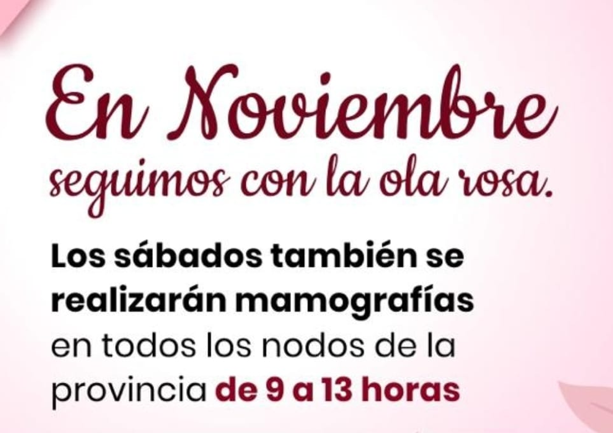 «Terminó el mes de octubre rosa, pero vamos a continuar con el cuidado y la protección de la mujer. Hemos decidido que todos los sábados de noviembre, de 9 a 13, en los 18 nodos donde hay un mamógrafo, podrán acudir las mujeres sin solicitud del médico«, confirmó Medina Ruiz.