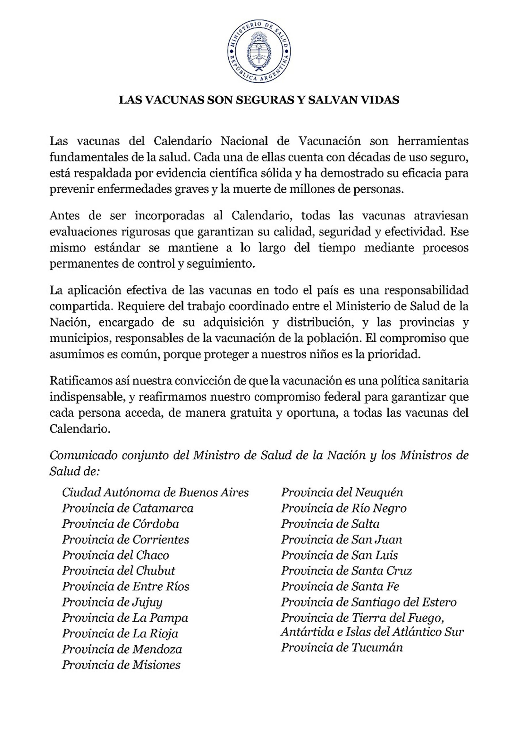 El texto, que lleva el título “Las vacunas son seguras y salvan vidas”, hace hincapié en la “responsabilidad compartida” entre la Nación—que tiene a su cargo la adquisición y distribución de las dosis— y las jurisdicciones provinciales y municipales, encargadas de su aplicación concreta en cada territorio.
